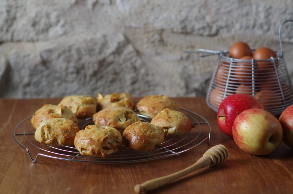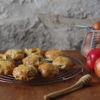 En dat houdt op zijn beurt weer in dat ik wafels, pancakes en, in dit geval deze appelbroodjes, niet met gist of bakpoeder maak, maar met Liam. Heb je geen zuurdesem starter, dan gebruik je gewoon bakpoeder.